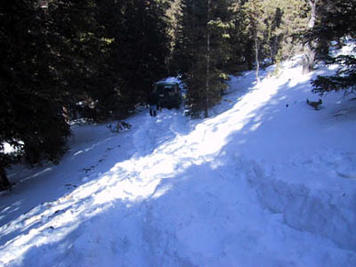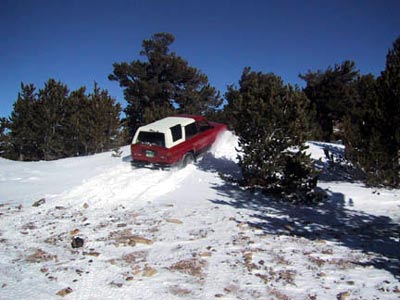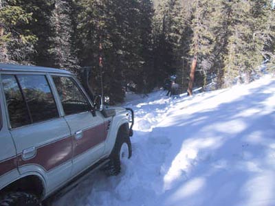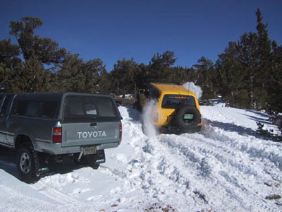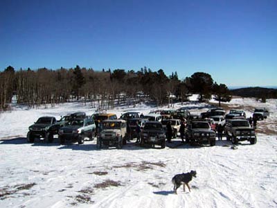 The 2003 Annual Snow and Pizza Run was a huge success! When I showed up in the parking lot that morning, I couldn't believe how many rigs where already there. And, I was relatively early - people just kept streaming into the parking lot. We certainly struck gold in the form of attendance. This was the line-up: 1. Kevin Ehrlick (Biege FJ-62) 2. Scott Yoder (Jade Green 4Runner) 3. Jeff Zepp (SeaFoam Green FJ-40) 4. Wayne and Berni Smith (White HZJ-75 P/U) 5. Steve Crase \ Dave Armbruster (White FJ-62) 6. Phil Simmons \ Jan Patton (Gold Taco) 7. Michael Aaron (Dark Blue FZJ-80) 8. Christo Slee (Yellow FZJ-80) 9. Robbie Antonsen (Grey FZJ- 80) 10.Ben Swain (Gray Bobbed Mini) 11.Al Ostoff (Gray FJ-40) 12.Matt Farr \ Dan Schrad (Green FJ-40) 13.Scott Brown (Yellow FJ-40) 14.Mike Edwards (Charcoal FJ-40) 15.Dan Dilley (White FJ-40) 16.Dan Markofsky (Green FZJ-80) 17.Perry Loughridge (Gray Runner) 18.Ige Gustavson (Light Biege FJ-60) 19.Greg Leur (Red Runner) 20.Russ Leverman & his son Dustin (green FJ-40) 21.Terry Holben (Green/Beige FJ-55) 22. Dan Reinmuth (yellow YJ) 23. John \ Terry Olsen (Red FJ-40 wants to join RS) 24. Danny Dilley (Yellow Bob Barker mini) 25. Brian Sandoval (86 Mini) 26. Bill Van Beek (Brown FJ-60) 27. Jack and Tish XXXX(Gray FJ40 Nevada - wants to join) 28. Jeff Alleman (Black FJ40) 29. Bruce Lawson (Red FJ60) 30. Chris Rayburn (silver & gray FJ80 with V8) off-road solutions 31. Jason Meyers (94' Ext. Cab) 32. Randy Harris (Red XJ, 4XEXPRT) 33. Bob Olsen (Red FJ-60 BoBo) Kevin Ehrlick was our trail leader. After we all rolled out of Central City and up to the first meadow to air down, we had 33 Toyota's in the group. This was a new Rising Sun record. It was really was an impressive show of nicely built Land Cruisers. I was particular impressed with some of the modified FJ40's and FJ80's. Everybody's vehicles were extremely well prepared. Shortly before 10:00 we stopped to re-group and take a photo. Then, a small aggressive group split off and took an un-chartered trail. They were blazing the trail through some really deep snow. I believe some of the members of this group were Dan Dilley, Mike Edwards and Scott Brown. They were able to go pretty far, winching numerous times. They were also the last ones back at the end of the day. The rest of us continued on to see how far we could get. The snow soon started to get really deep - with huge drifts here and there. The area was nice because there were small trails in several directions that offered fun for everyone in the group. Several of us took a trail that led down a hill into the woods - blazing fresh tracks all the way. We were all getting nervous because of the likelihood that we would have to turn around somewhere and make it back up this hill. Terry Holben was leading in his FJ55 Pig. We barely got him turned around and pointed uphill without siding off the trail. We then spent quite a bit of time winching terry up the hill and getting everyone going again. Luckily, the rest of us were able to turn around. We all charged up the hill with Christo Slee in the lead. Terry was having some carburetor\overheating problems at this point, so Chris Rayburn in his very large V8, FJ80 strapped him up the hill with gusto. The remainder of the group met back up top and hit some final snow drifts and got stuck a few more times. Then we were off to Central City to hear how everyone did and enjoy some pizza and beer. What a great way to end the day! Scott Yoder |